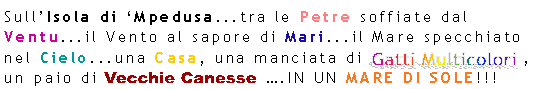 Lampedusa è prima di tutto un’emozione..che arriva subito sl cuore o non ci arriva...qui è tutto estremo...non sono ammesse le mezze misure….amore e malia a prima vista o insofferenza e insoddisfazione… Lampedusa è un pezzo di roccia in mezzo al mare, una zattera di pietra ancorata al largo della costa africana, perennemente sospesa tra un mondo e un altro, in bilico tra le radici africane e l’appartenenza italiana. Il risultato del bilanciamento mai risolto è un’isola calda e ventosa... quasi priva di vegetazione a parte rari esempi di rimboschimento e coraggiosi tentativi di giardinaggio, ...polverosa e salmastra … disordinata … l’architettura del paese è scarna e semplice, niente a che vedere con le isolette greche di bianco e azzurro vestite,… IL MARE è protagonista e dominatore, tutto decide e tutto comanda, se la nave arriva, se i pescherecci escono… e su di lui comanda IL VENTO, che soffia quando vuole, asciuga i panni e i pensieri quando è da N-NW, inumidisce le foglie di rugiada salata al mattino e appiccica le parole quando è da Sud e dintorni...e sopra a tutto si apre IL CIELO, coi suoi tramonti e le sue albe, le stelle infinite, le nuvole che si rincorrono veloci... |